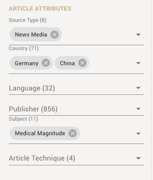 Adding another attribute in the same filter category expands the display to include figures that have either of the attributes (logical OR). Filtering on Country: China and Country: Singapore will limit the Gallery to figures that appear in articles whose publisher is based in either of the two countries.