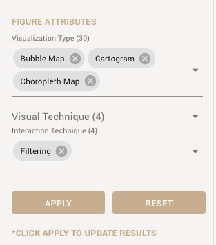 Filtering with Figure Attributes works the same as Article Attributes. Where the article categories are shared by all figures in an article, the figure categories are specific to each figure. One article may contain bar charts, line charts, and choropleth maps. Adding Visualization Type: choropleth map will limit the Gallery to only the choropleth map figures.
